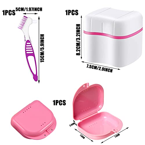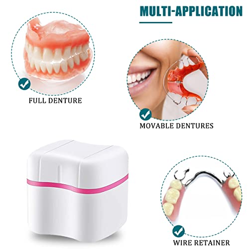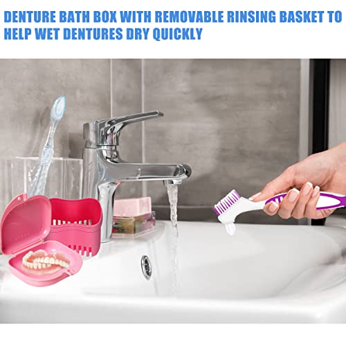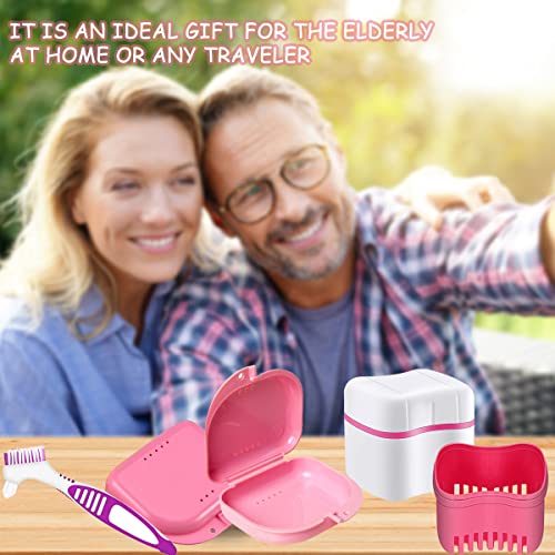 prothese box, tandprotheses container met zeef, met prothesen reinigingsborstels, voor het bewaren van valse tanden, roze.