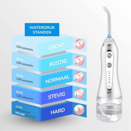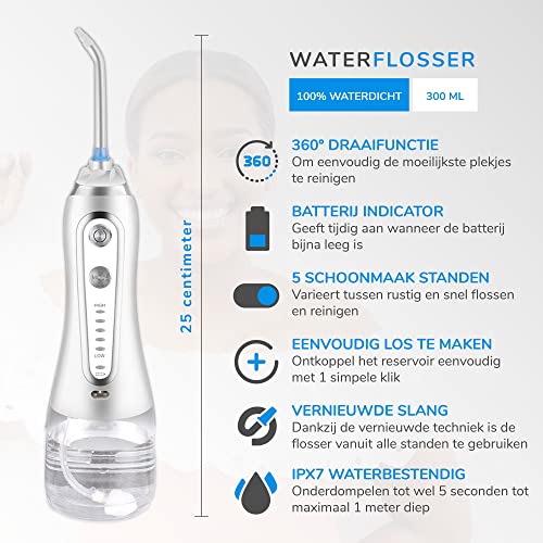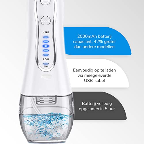 Last van tandplak of zwak tandvlees? Deze elektrische waterflosser houdt je gebit voortaan sterk en gezond. De 5 verschillende waterdruk standen met 1200 pulsen per minuut verwijderen 99,99% van alle voedselresten en tandplak. De ingebouwde 2000mAh batterij is op te laden via een stopcontact of USB-poort en gaat op een volle accu tot wel 20 dagen mee. Kies voor een gezond gebit en ervaar zelf het verschil! Een gezonder gebit 52% van de Nederlanders heeft recentelijk last gehad van een slechte adem, tandplak of gevoelige tanden. Alleen tandenpoetsen is vaak niet voldoende! Deze elektrische waterflosser gebruikt hogedruk pulserende waterstralen die de bloedsomloop in het tandvlees stimuleren en zorgen voor een gezonder en sterker gebit. IPX7: Veilig voor onder de douche De elektrische waterflosser heeft een IPX7 waterproof rating. Dat houdt in dat de waterflosser probleemloos ondergedompeld kan worden in een bak water van max. 1 meter diep. Je kunt de waterflosser dus veilig onder de douche of in bad gebruiken! Opladen via USB of stopcontact De krachtige 2000 mAh lithium batterij in de waterflosser gaat op een volle accu tot wel 20 dagen mee. De accu is volledig opgeladen binnen 5 uur. Je kunt de waterflosser opladen via het stopcontact, maar wanneer je onderweg bent of op reis kun je ook gebruik maken van een USB-poort.