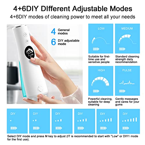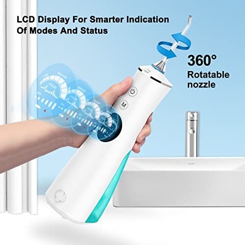 Inbegrepen functies: 7 monddouchepunten (5 klassieke, 1 tongschraper, 1 orthopedische kaak) voor de behoeften van meerdere familieleden en digitale weergave, mondstukstandaard, oplaadbaar, 90 seconden tandzijdetijd, 6 trapsdruk-doe-het-zelf-instellingen, 360 graden draaibare sproeiers, IPX7 waterdichte multifunctionele functies. Het digitale display biedt een modelvoorinstelling, intelligente batterijbehoud.