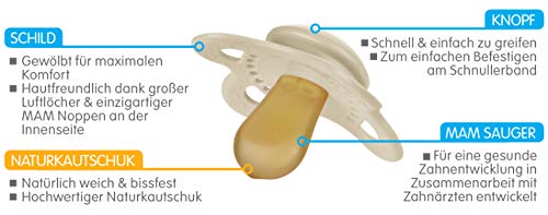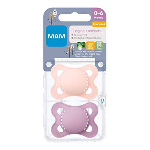Specification: MAM 80970522 Original Elements fopspeen in een set van 2, symmetrische & tandvriendelijke babyspeen van natuurlijk rubber, speen met borstvoedingsvriendelijke vorm, met speendoosje, 0-6 / Latex / Dag, Roze/paars