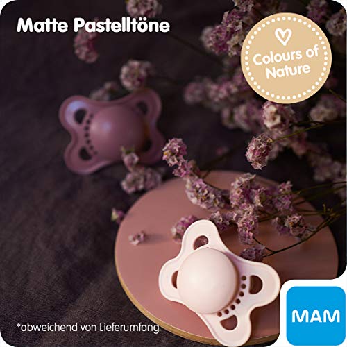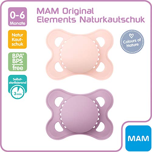 MAM 80970522 Original Elements fopspeen in een set van 2, symmetrische & tandvriendelijke babyspeen van natuurlijk rubber, speen met borstvoedingsvriendelijke vorm, met speendoosje, 0-6 / Latex / Dag, Roze/paars