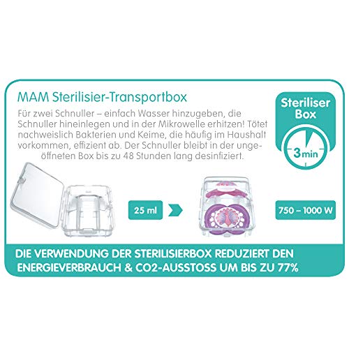 Zelfsteriliserende functie – De MAM-speen kan makkelijk en snel in de magnetron worden gesteriliseerd in het sterilisatie- en transportdoosje. Extra apparatuur is niet nodig.