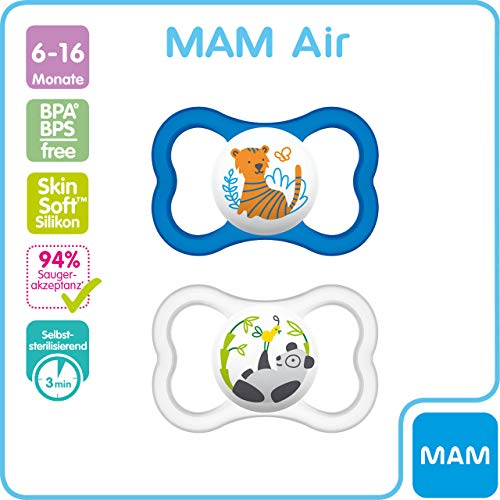 MAM Air siliconen fopspeen in een set van 2, extra licht & luchtig babyspeen, tandvriendelijke speen van speciale MAM SkinSoft-siliconen met doosje, 6-16 maanden, blauw