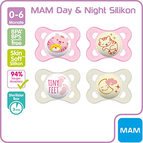 Specification: MAM Day & Night fopspeen in set van 4, 2x MAM Original & 2x MAM Night speentjes, tandvriendelijke babyspeen van MAM SkinSoft siliconen met doosje, 0-6 maanden, tijger/voeten/maan