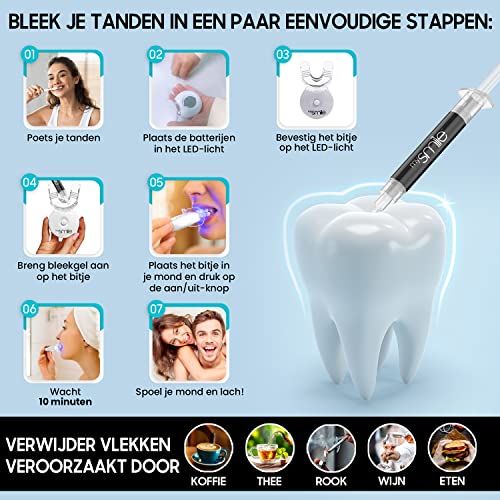 Alles in 1 set – Deze set bevat een blauw LED-licht, een bitje, activated charcoal bleekgel, een voortgangskaart en een duidelijke handleiding zodat je direct aan de gang kunt met het bleken van je tanden. De bleekgel is gemaakt van natuurlijke ingrediënten waaronder activated charcoal en is 100% peroxidevrij.