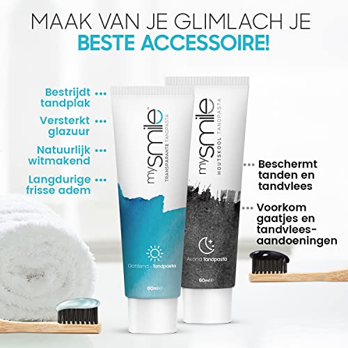 S ochtends en ‘s avonds poetsen – De mysmile whitening kit voor het bleken van tanden bevat een oplossing tegen tandvlekken en voor het versterken van tandglazuur. Onze kit bevat twee unieke tandpasta’s. Een tandpasta voor het bleken en een tandpasta met actieve kool voor het verwijderen van verkleuringen. Zeg vaarwerl tegen gele tanden!