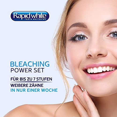 Inhoud: 1 x bleekpowerset, bestaande uit 1 x bleekgel, 1 x versneller, 2 x tandrails met houder en 1 x tandbleekcrème van Rapid White.