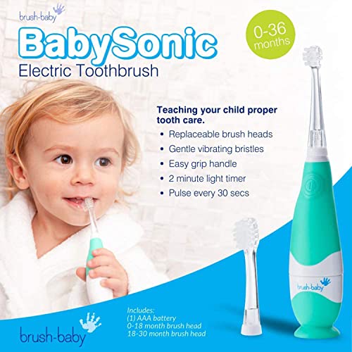 Brush-Baby BabySonic Elektrische tandenborstel voor baby’s en peuters | Eerste tanden | 0-36 maanden | LED-licht, zachte trillingen, 2-min-timer & zuigvoet | Inclusief 2 borstelkoppen & 1 AAA-batterij