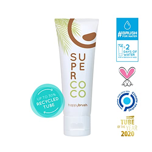 INHOUD: 1x SuperBlack, 1x SuperWhite, 1x SuperCoco, 1x SuperGreen, 1x SuperClean happybrush tandpasta. Plasticvrije buitenverpakking gemaakt van FSC-gecertificeerd karton.